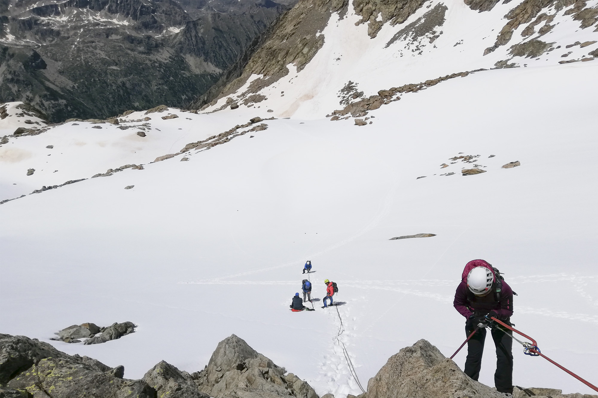 3° GIORNO: sveglia con un po’ più di calma, colazione e poi si parte per la scuola di roccia. Non servono le scarpette da arrampicata perché questa giornata vuole essere un'introduzione alla scalata sui gradi facili: tipici delle vie normali di molte montagne e di alcuni passaggi delle Hautes Routes – fino al 3° grado al massimo – spesso incutono soggezione e creano incertezza, per poi scoprire che, su questo livello di impegno, mani e piedi trovano sempre appigli e appoggi comodi e sicuri. Un po' di convinzione e consapevolezza ed ecco che anche questi “ostacoli” si trasformano in momenti stimolanti e di piacevole gestualità. Il programma si completa con l’apprendimento della tecnica di discesa in corda doppia, anch’essa necessaria in svariate occasioni, e di nuovo tutti scopriranno una manovra fonte di divertimento con un pizzico di adrenalina.