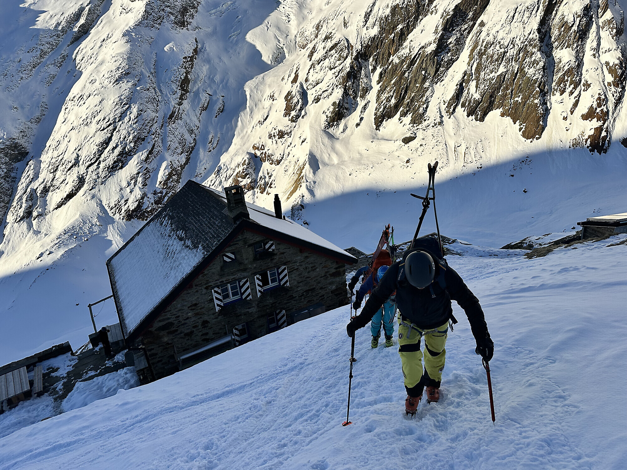 Il terzo giorno si affronta subito una parte tecnica: calzati i ramponi e impugnata la piccozza a già partire dal rifugio, si sale un primo tratto molto ripido in una sorta di canale, per poi proseguire più dolcemente fino alla Sustenlimi, una sella oltrepassata la quale si procede in salita su ghiacciaio per raggiungere quella che è “la vetta” dell’intero tour, il Sustenhorn. Di qui si fa una lunghissima sciata lungo lo Steingletscher per arrivare al Berghotel Steingletscher, a circa 1860 metri di quota, dopo essersi goduti una sciita di 1500 metri di dislivello, prima su ghiacciaio, poi sulla parte morenica, sempre su neve farinosa.